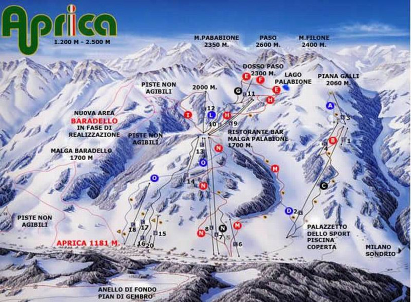 Aprica to samodzielny region narciarski położony nad doliną Valtellina na wysokości 1180 m. n.p.m. Teren narciarski rozpościera się na północnych zboczach dzięki czemu może poszczycić się dużą trwałością pokrywy śnieżnej. Łączna długość tras to około 50 km o bardzo zróżnicowanym stopniu trudności, leżących pomiędzy 1.200 m, a 2.600 m n.p.m. Słabsi narciarze mają do dyspozycji szereg łatwo dostępnych, mało stromych tras, lepsi natomiast będą mieli okazję sprawdzić się na stokach, gdzie od lat trenuje włoska kadra narodowa! Dwa najpopularniejsze szczyty to Dosso Paso (2600 m. n.p.m.) i Monte Filone (2300 m. n.p.m.), połączone z Apricą nowoczesną kolejką gondolową. Ośrodek posiada bardzo bogatą infrastrukturę dla dzieci.
